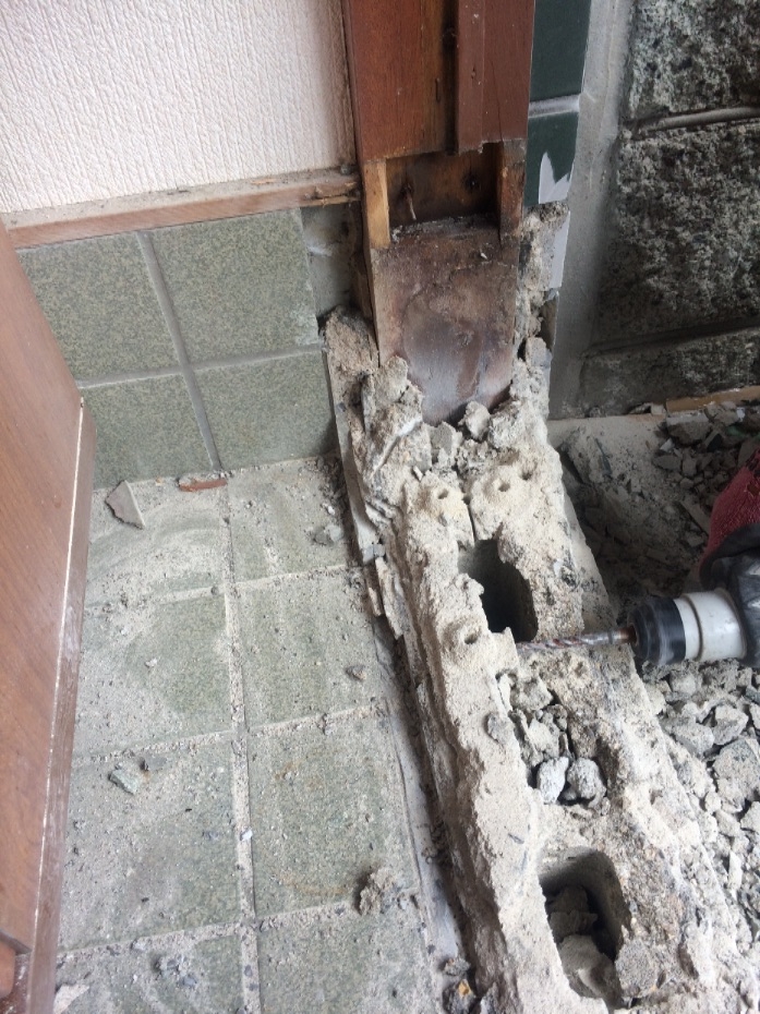 工法はカバー工法になります、袖の部分の下をハツリ、親子ドアを取り付けます。